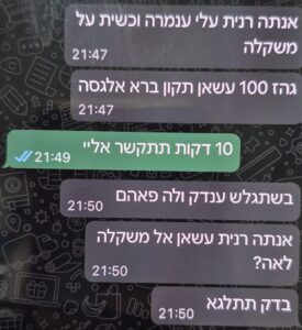 באותו יום ממספר אחר, נשלחה הודעה שוב בהזדהות מוחמד חרירי יחד עם דרישה לתשלום מיידי והוראות מסירה בצירוף איום, *״אם תיהיה טעות אחת, אחורר את הראשים של כל המשפחה שלך״* | *״אם יגיע מישהו איתך, נוריד אתכם במקום״.